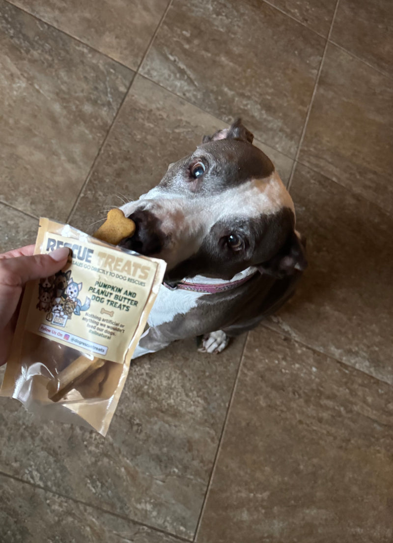 Giving back with every treat. Profits from our partners, Rescue Treats, are donated to dog rescues, because every pet deserves a safe, loving home.